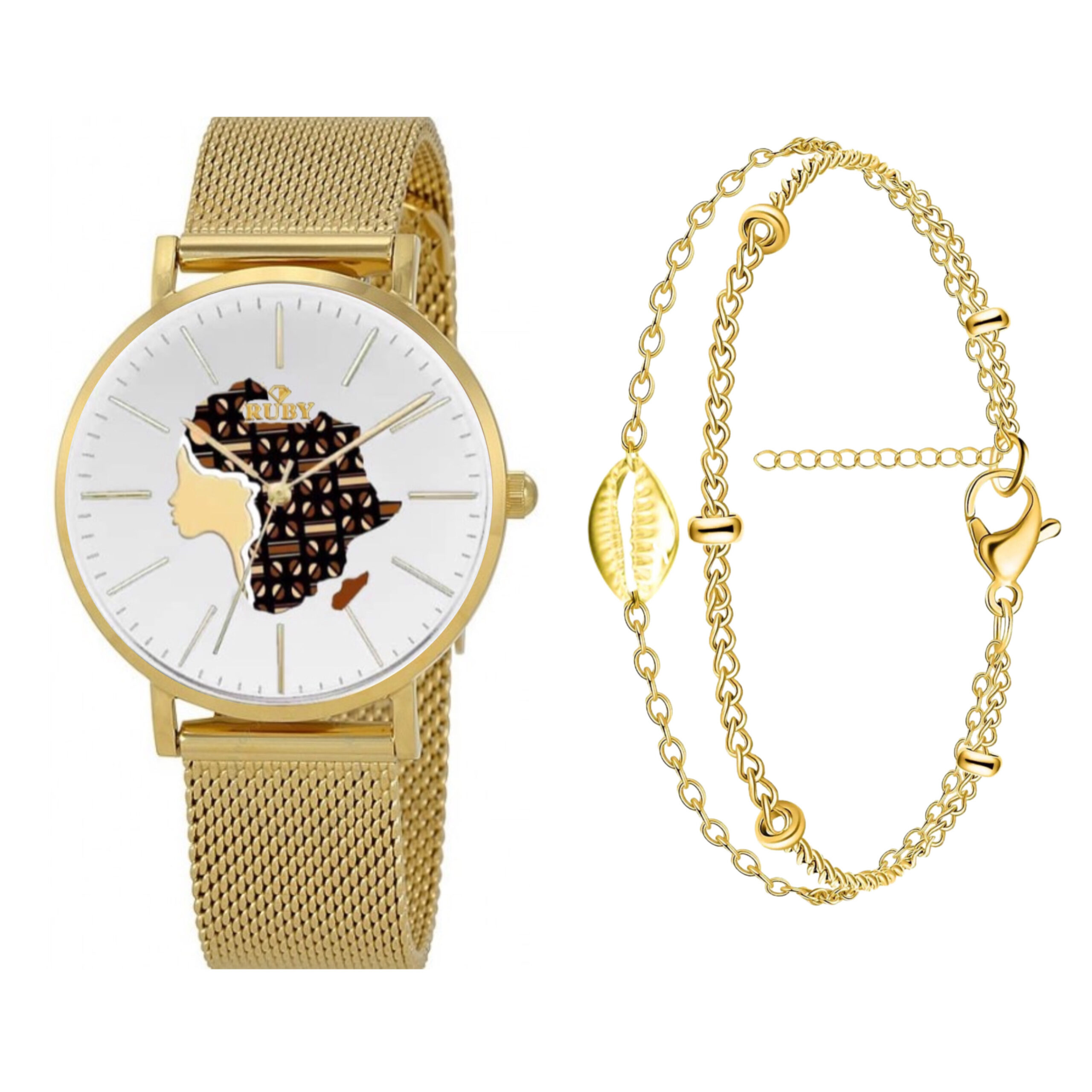 Ce coffret est composé d’une montre TOKOSSEL (Petite en pulaar) et d’un bracelet petit KORI en acier inoxydable plaqué or